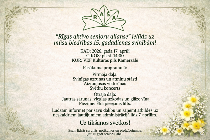 Biedrība “Rīgas aktīvo senioru alianse” šogad svin nozīmīgu jubileju – 15 darbības gadus.